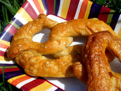 Line baking sheet with parchment paper and oil paper, then arrange pretzels on sheet. Brush pretzels lightly with some of egg and sprinkle with pretzel salt. Bake until golden brown and lightly crusted, about 35 minutes (mine did not need to bake anywhere near this long, but mine also appear to be thinner than Joy the Baker's). Cool 15 minutes, then serve warm. (I also only needed to cool mine for 5 minutes or so before serving. But perhaps that's just impatience.)