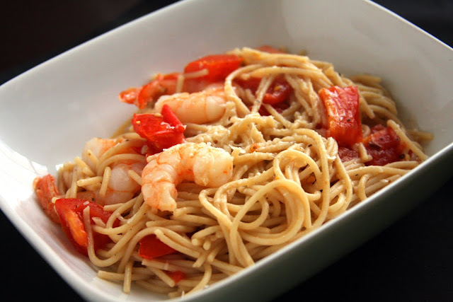 I was short on time & ingredients, and we were going out of town soon, so I had to make do with what I had on hand. Luckily that included a big bag of frozen shrimp, whole wheat pasta, half of a red pepper, & a lemon. I wouldn’t normally think it would make a delicious meal, but whaddya know, it did! I thought the chili flakes made this a spicy meal. The lemon really helped to balance out the heat, and added some twist. Of course, The Boy didn’t think it was hot at all, but he did think it was very good! This was a healthy, filling, and simple dinner. Those are always nice to have on hand when you haven’t got much time!