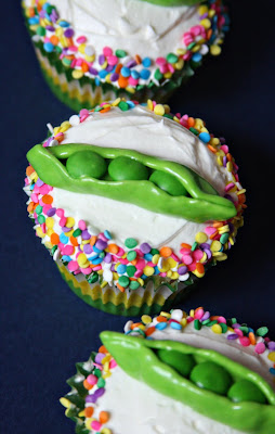 For decorations, Roll out each of the green fruit chews into a 3 x 1-in. oval 1/8-in. thick. (If you're having a hard time rolling out the candy, 3-7 seconds in the microwave will soften it up.) Press 3 skittles onto one side of each oval. Fold the other side over to cover the candies slightly. Pinch the ends and place 1 pea pod on top of each of the cupcakes.