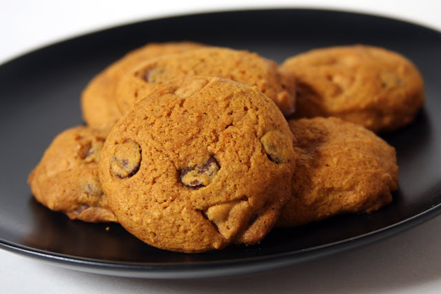 If you’re looking for a fresh, delightful cookie recipe to showcase some canned pumpkin you’ve been lucky enough to procure, then look no further. These would be great served up at a Halloween party, with their orange color and the dark brown chocolate chips; especially served up on a black plate like this!