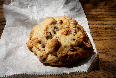 Ok. Everything said about this cookie is true. It totally lives up to the hype. Holy cow this cookie was awesome! I got two chocolate walnut (the famous version), a dark chocolate with peanut butter chips, and an oatmeal raisin. The Boy & I spent TWO days eating the peanut dark chocolate with peanut butter chips, and I gave the other three away. Not to mention these cookies were FRESHER than fresh. WOW. I noticed they were pulling trays out of the oven as soon as I walked in. My cookies were STILL WARM when I got them!