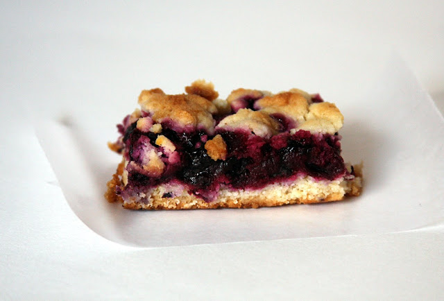 Don’t you just love blueberry season? If you’ve read my blog even occasionally you know I love brightly colored food. I’m drawn to it like a fly to honey. Early on in my blog surfing days I saw these bars on Smitten Kitchen’s blog. I have no idea why it took me a year to make them, but I’m so glad I finally did. They were every bit as dreamy delicious as I thought they’d be.