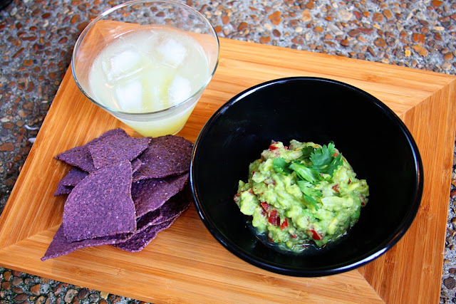 Up first is our appetizer and drinks. I had some blue corn chips I purchased for the chili competition, but didn’t end up taking with me. While at the grocery I decided to pick up an avocado, so we could enjoy guacamole with the blue corn chips. This is a basic, simple guacamole, that is also quite delicious. This is pretty much how I make it each time, and it’s never disappointed me. We enjoyed our appetizer while waiting for the chicken to finish cooking. It was perfectly complimented by my homemade margaritas.