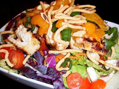 Chop vegetables, toss with lettuce. Cook chicken & cut into pieces. Add to salad, top with oranges, almonds, & noodles. Serve with dressing of your choice.