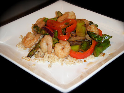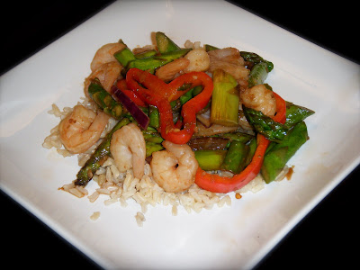If you’ve never been to the website Tastespotting, you’re really missing out. It’s what I call “food porn” (I didn’t come up with that!). It’s a great way to discover new foods & new food blogs. I’m proud to say I’ve made it on there a few times too! It was through Tastespotting I discovered Gina’s Weight Watcher’s Recipes. She has a great blog, and I knew all the recipes would be pretty healthy, even though I’m not on Weight Watchers. I spent some time browsing it and came across this recipe for Chili Shrimp Asparagus Stirfry. I had purchased asparagus earlier in the week when I caught a great sale on it. So when I saw this recipe I was really glad to find a yummy way to use it, plus I had some ginger I wanted to use up. I also added some crushed red pepper to pump up the heat, as we like things a little hot. I served ours over brown rice.