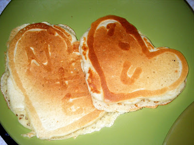 Using this Cooking Light recipe I saw on Food alla Puttanesca (who saw it on Cheap Healthy Good), I whipped up these simple Light Buttermilk Pancakes. I put some of the batter in a squeeze bottle. I then drew the heart shape, and wrote I (heart) U inside it. I wrote this because an I, a heart, and a U would look the same both ways! Let the outline cook for a little while, then fill it in with the rest of the batter. Because the outline is drawn first, it cooks a little longer, and gets darker than the rest of the pancake. I saw this done in the Jan/Feb issue of Food Network magazine. Click here to see more on Food Network’s site.