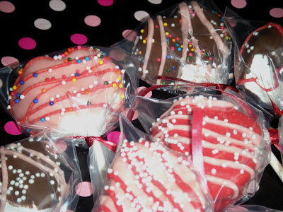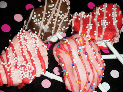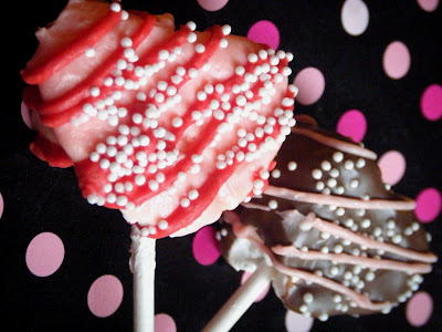 After cutting marshmallows, place on stick. Melt almond bark or candy coating in double boiler or in a glass bowl over a pot of steaming water. (I've never tried the microwave method, as I just know I would fail.) Dip marshmallows in candy to coat as much as you want. I chose to stick my sticks into cardboard with holes (I would of preferred styrofoam, but I didn't have any), but some of the marshmallows would fall down their sticks. If this happens, just eat those, and continue on (kidding...). I found that the ones I had to rest on wax paper did not end up looking all that bad. If you choose to sprinkle on the nonpareils do so when coating is still wet. Also I found that if you sprinkle over a bowl or in my case an 8x8 pan, you can save all the nonpareils that don't land on the candy, and just pour it back in the bowl. If you're thrifty like me! 😀